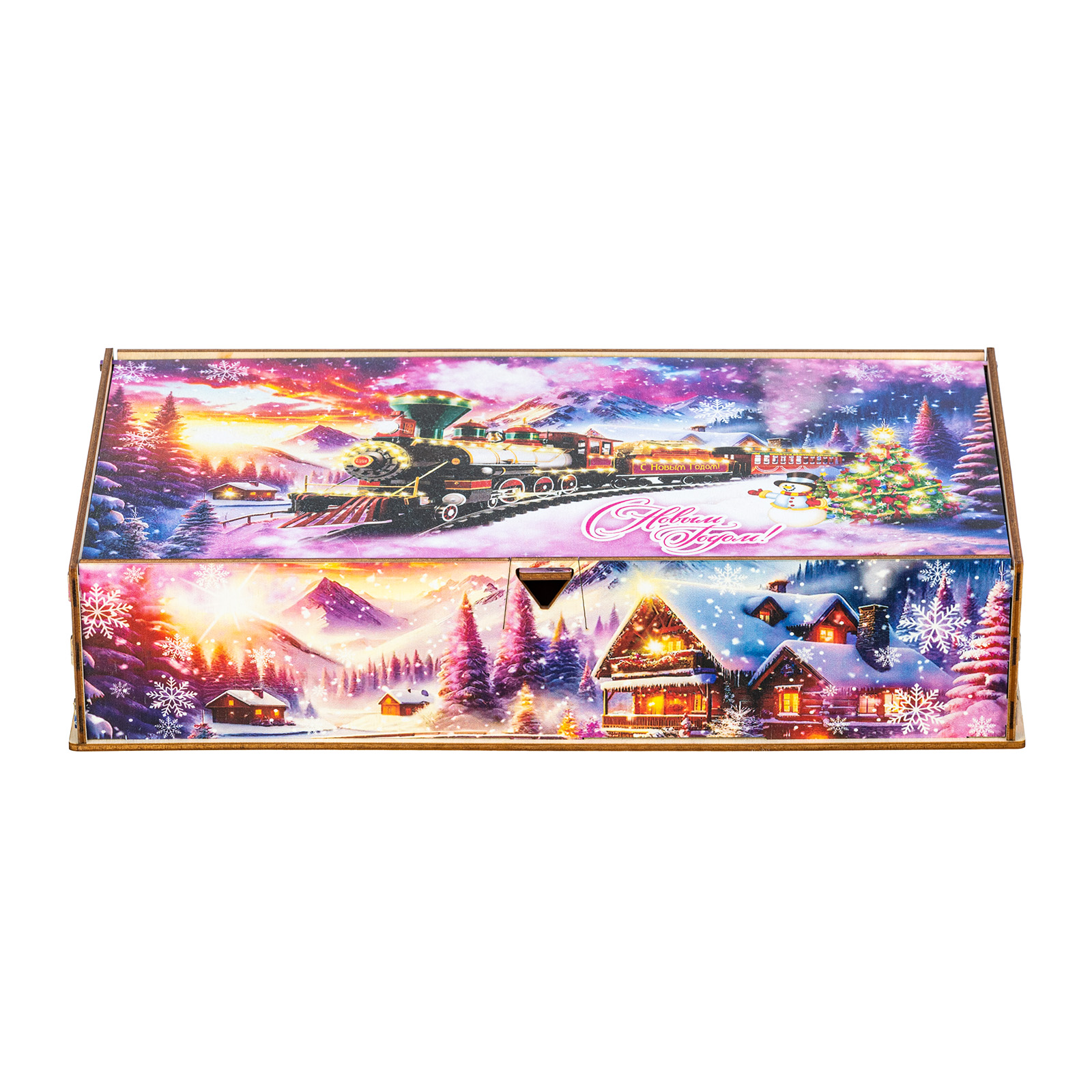 Секрет идеального новогоднего сладкого подарка прост: это яркая привлекательная упаковка и вкусные сладости внутри. “Снежный экспресс” - это подарочный набор, который как раз прекрасно подходит под эти характеристики. Это небольшая деревянная коробчка с очень необычным ярким оформлением. На ней изображен зимний вечер в небольшой деревне, рядом с которой по железной дороге весело мчится праздничный поезд. В этом поезде находятся счастливые люди, которые вот-вот смогут увидеться со своими родными и друзьями и отпраздновать с ними Новый год. В подарочный набор входит килограмм разнообразных сладостей, небольшой памятный сувенир и безграничная радость для всей семьи!